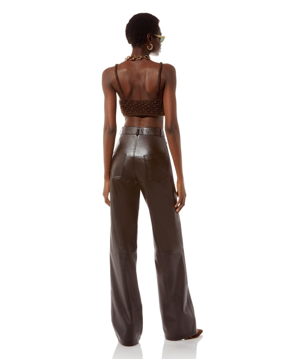 Pantalone in ecopelle modello dritto, vita alta a cinque tasche. Codine di topo sul davanti e tagli orizzontali ad altezza ginocchio. Chiusura con zip nascosta e bottone personalizzato MVP.